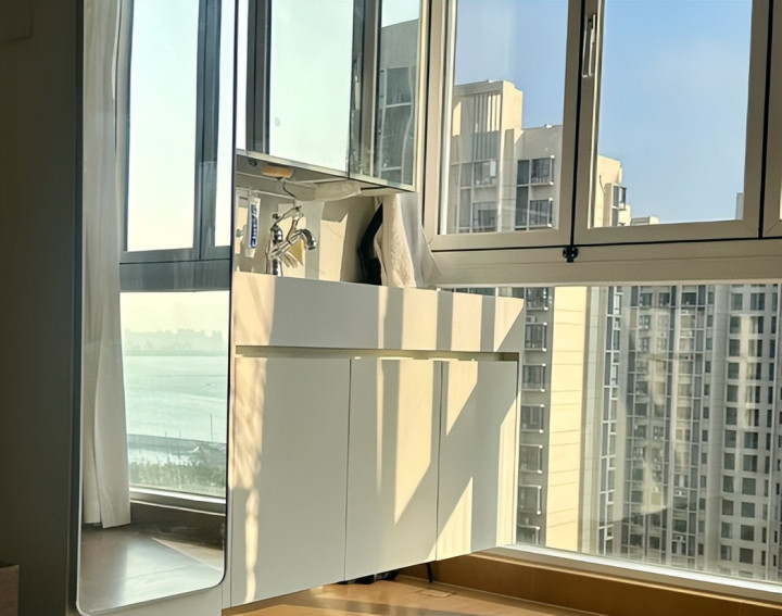 有的人家阳台的面积很大,为了能提升使用便利,业主并没有将其当做晾晒区域,而是将阳台打造了一个洗衣区,将洗手台放在这里我们用着也很方便。