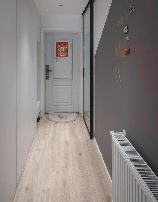 玄关属于狭长型,考虑到实用性和空间舒适度,定制了组合式柜子,鞋柜与储物柜结合,不仅提供了充足的收纳,还让换鞋变得轻松许多。柜子对立面是厨房和黑板墙,灵活的移门设计,作为玄关采光的补充,黑板墙让狭长的过道多了几分趣味性。