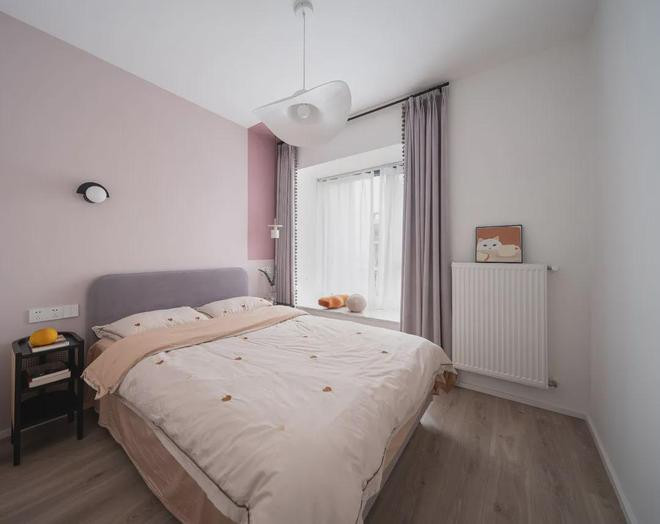 主卧简单舒适,莫兰迪粉色系打造高级感,它的灰度让色彩变得高贵柔和,既温馨又浪漫。照明上也是多元化,适合各种场景使用需求。