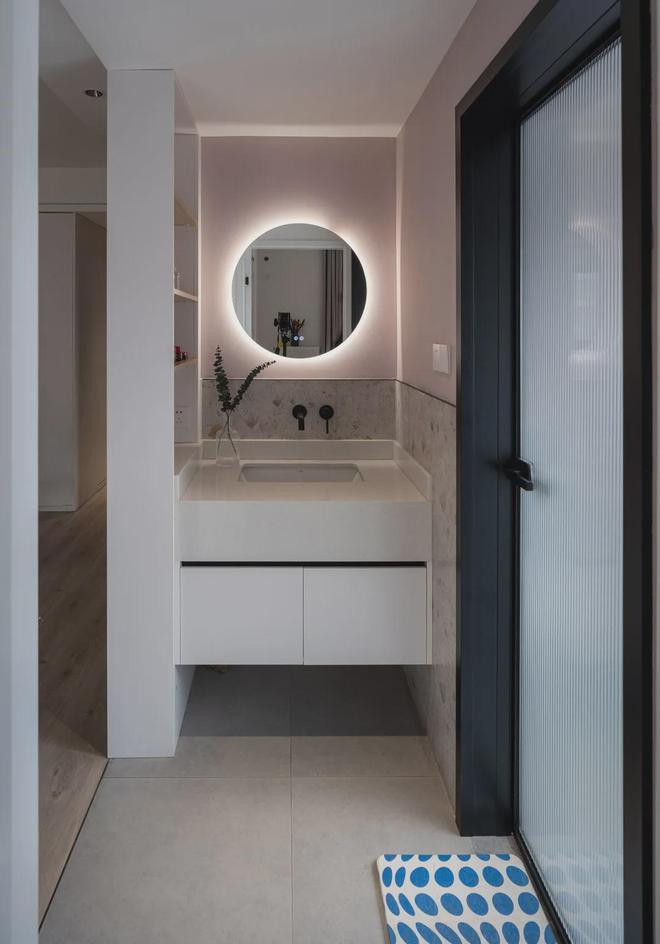 卫生间采用分离式设计,让日常使用更方便。干区隐藏在隔断柜后方,小巧而精致。由于台面空间有限,在左侧墙面做了收纳。带灯带的圆镜子,满满的少女心!