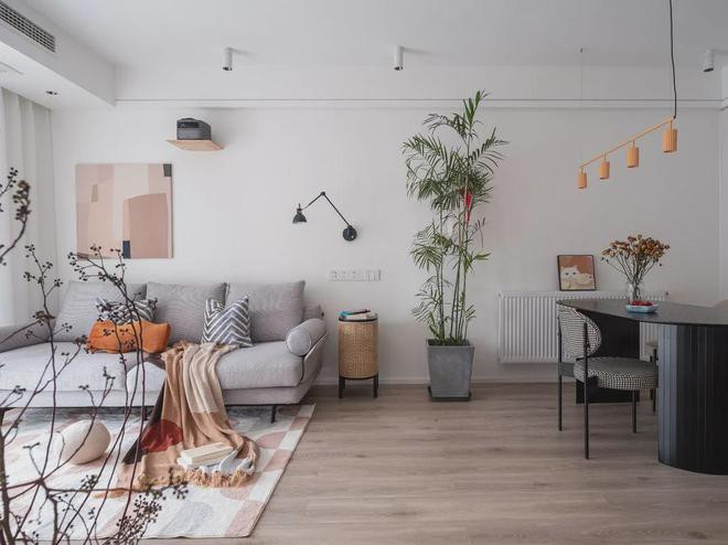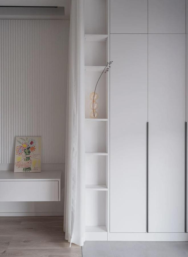 拆除了客厅与阳台推拉门,改用窗帘做隔断,让空间更灵活通透。利用阳台内凹的结构,定制了储物柜,封闭式与开放式结合,不呆板收纳也轻松。