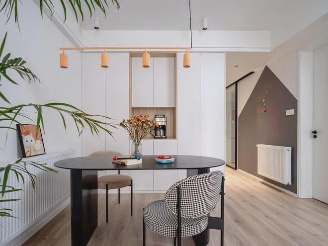 餐厅干净简约,白色的餐边柜,搭配简约式的黑色餐桌,简单实用又不缺乏时尚气质。原木色的吊灯与整体风格相呼应,并不显得突兀,空间明亮雅致。
